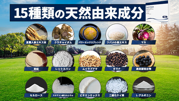男性力の根源となるパワーミックスブレンド末をベースに高麗ニンジンやマカなど、天然由来成分を15種類も濃縮配合。